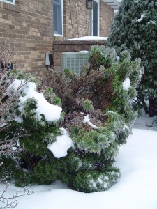 Saggers. Lots of arborvitae, Leyland cypresses, yews, boxwoods and similar evergreens might look badly misshapen, though not quite broken apart.As temperatures warm, these might spring back into shape better than you think. So wait until the weather warms consistently before doing anything drastic.
