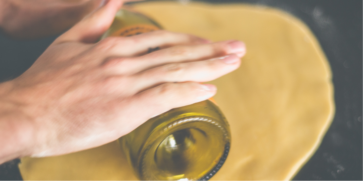 A wine bottle is a perfect makeshift rolling pin, and is heavy enough to get smooth, evenly-rolled out dough. You can either remove the labels and wash it thoroughly, or simply wrap it in a layer of parchment paper. The parchment paper will also prevent your dough from sticking.