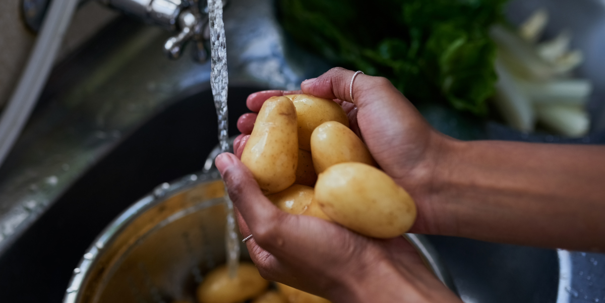 Rather than wasting half an hour scrubbing potatoes, run them through the dishwasher on the rinse cycle with no soap. They’ll be cleaner than if you brushed them clean, and you can even do it a day or two before if you prefer.