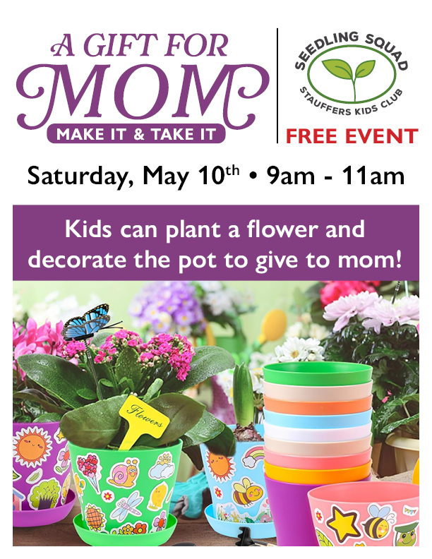 Come join the fun at our Home and Garden stores for a FREE event for kids, A Gift for Mom! Kids can plant a flower and decorate the pot to give to mom!