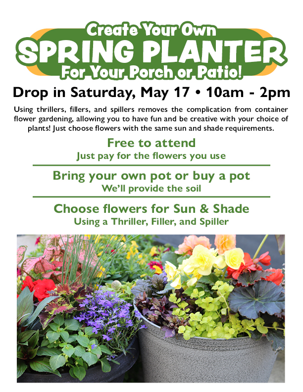Create your own spring planter for your porch or patio! Using thrillers, fillers, and spillers removes the complication from container flower gardening, allowing you to have fun and be creative with your choice of plants! Just choose flowers with the same sun and shade requirements.